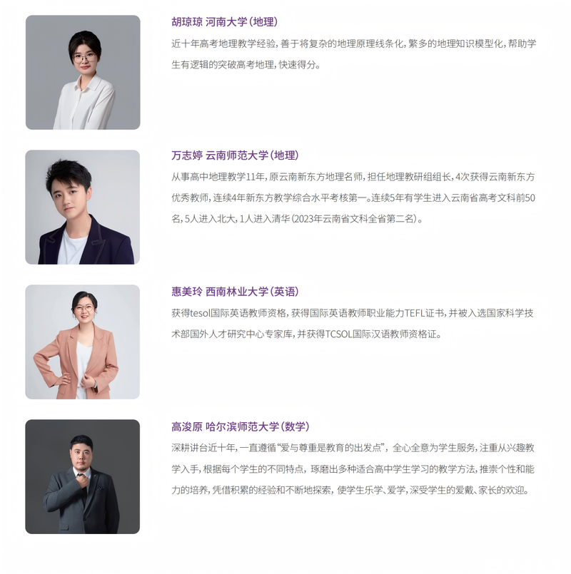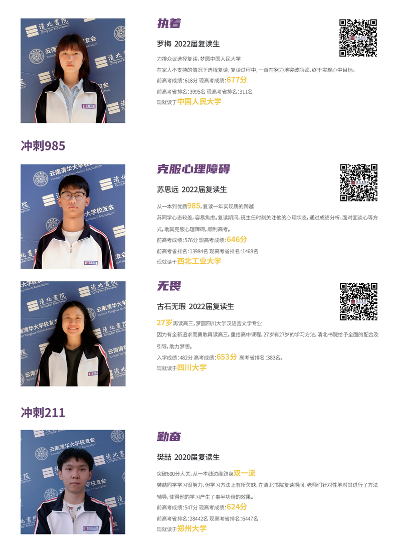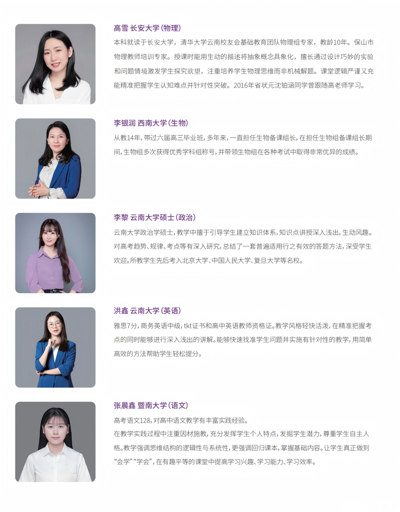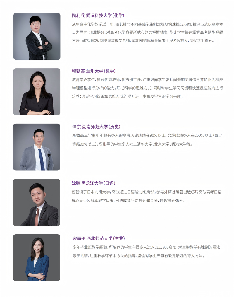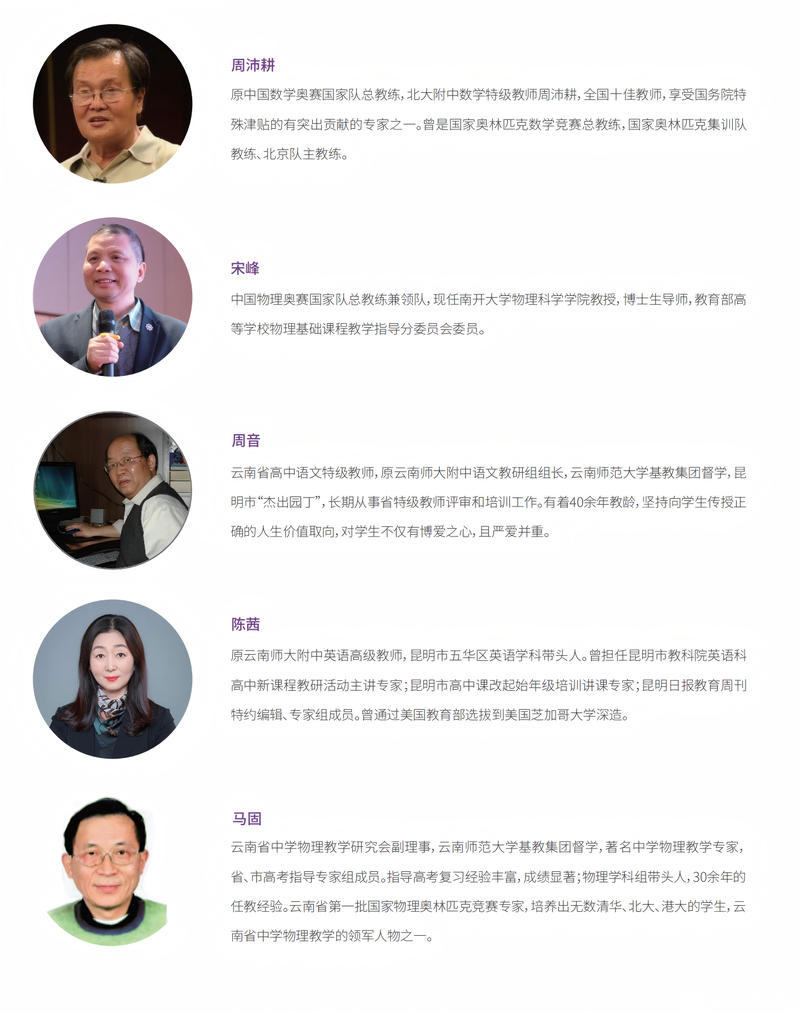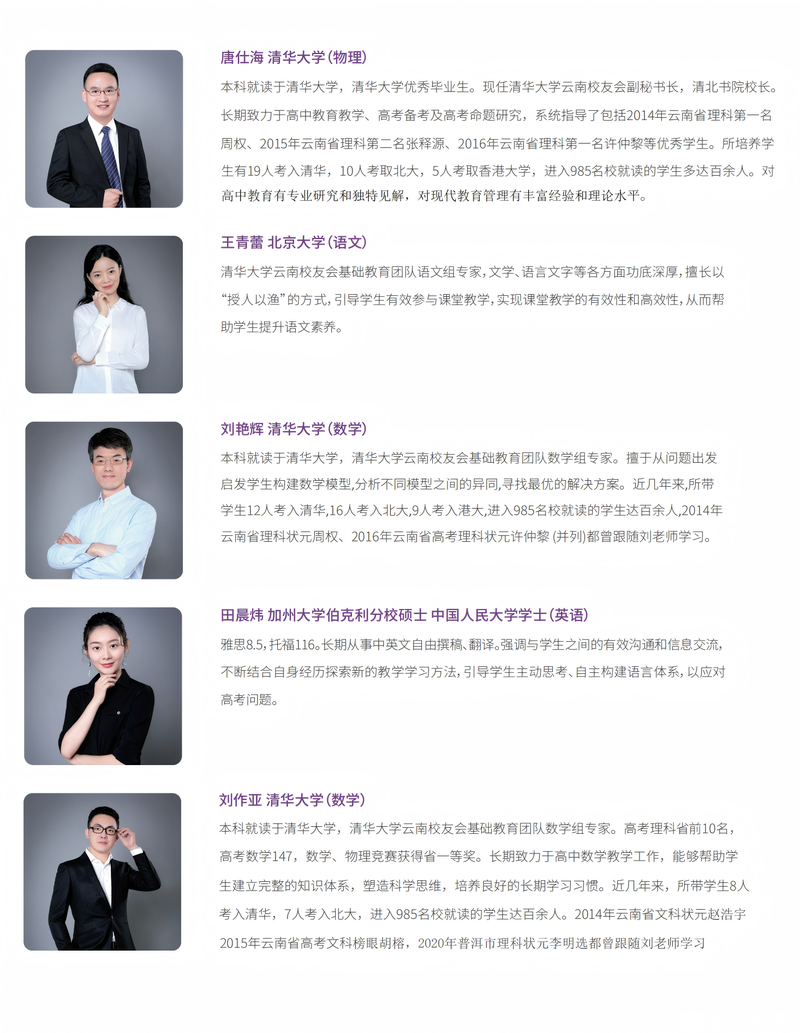 个人简介:本科就读于清华大学,清华大学优秀毕业生。现任清华大学云南校友会副秘书长,清北书院校长。长期致力于高中教育教学、高考备考及高考命题研究。系统指导了包括2014年云南省理科第一名周权、2015年云南省理科第二名张释源、2016年云南省理科第一名许仲黎等优秀学生。所培养学生有19人考入清华,10人考取北大,5人考取香港大学,进入985名校就读的学生多达百余人。对高中教育有专业研究和独特见解,对现代教育管理有丰富经验和理论水平。