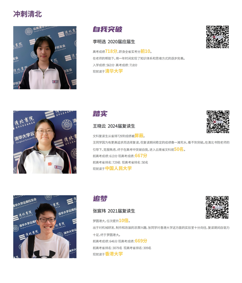 清北书院依托清华大学云南校友会,以“自强不息,厚德载物”的清华精神炼就团队师魂,以先行者的姿态在高中备考领域积极实践,提炼出高效的教学及学习体系。现团队教师大多是毕业于清华、北大、985等国内外顶尖名校的本硕毕业生,已将数十名学生送入清华、北大,积累了丰富的教学经验