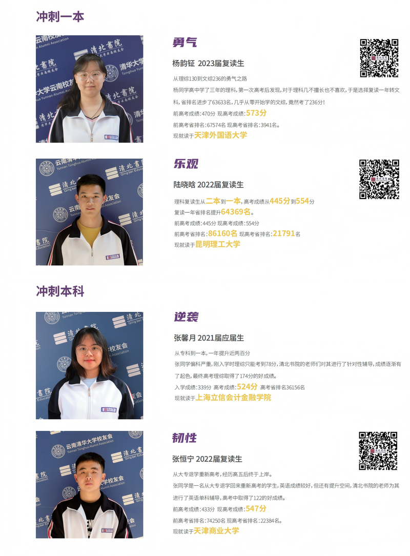 自成立以来,清北书院不断发展壮大,现有全日制高考备考、志愿填报及生涯规划、教辅资料研发等多个项目,其中备考复读学校涵盖全日制高三应届备考、往届复读及艺体生文化课集训三大方向。