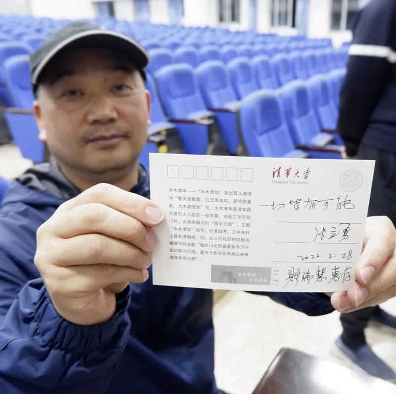 来自清华大学的张立勇老师看到一张把清华作为目标院校的便利贴后,连忙拿出一张清华大学的明信片,写下鼓励的话,送给这位同学。