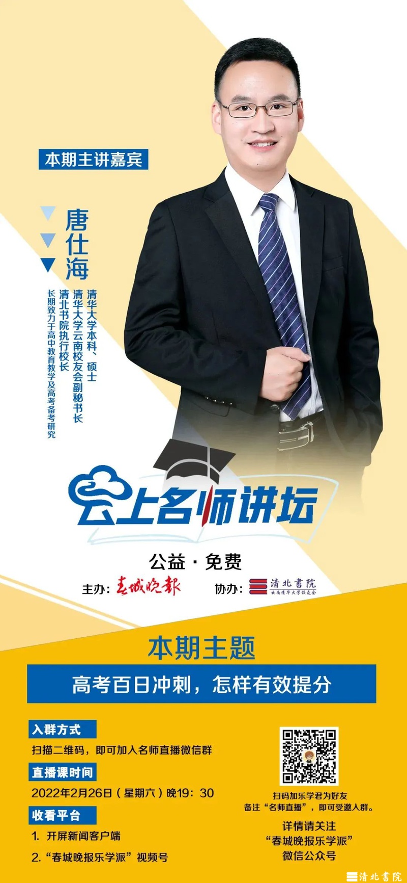 近日,清北书院联合春城晚报,推出了《云上名师讲坛》系列公益直播课程。