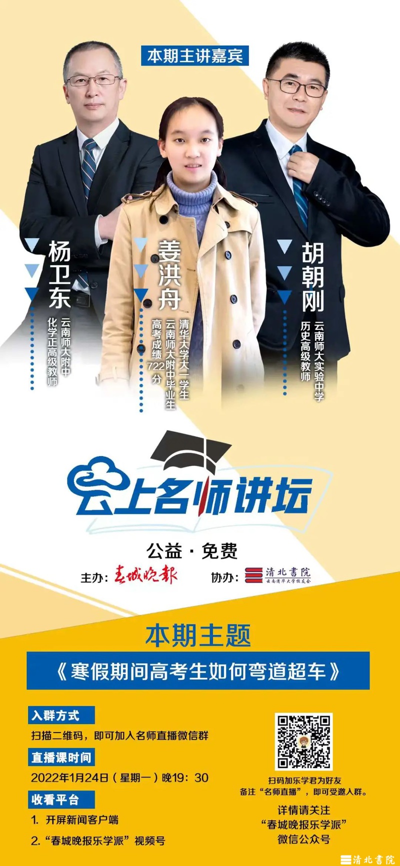 为了帮助大家更好地备战高考,清北书院联合春城晚报,推出了《云上名师讲坛》系列公益直播课程,将邀请众多名师、往届高考学霸,围绕学科备考、心理调适、志愿填报、升学规划等话题,在直播间为大家答疑解惑。