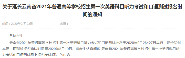 关于延长云南省2021年普通高等学校招生第一次英语科目听力考试和口语测试报名时间的通知