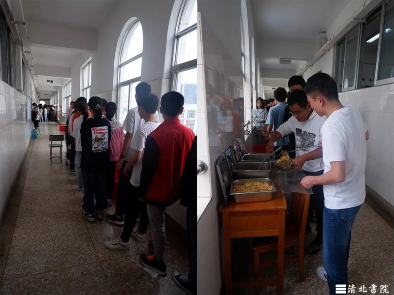 由于疫情防控还未完全结束,所以学生吃饭由学校食堂统一送到教室门口。吃完后由食堂收走餐盘进行洗刷。
